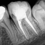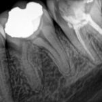 Estas radiografías pertenecen a una paciente que tuvo que realizarse un retratamiento de conducto (es decir que se tuvo que volver a hacer la endodoncia). La paciente presentaba dolor por infección y una pobre obturación con falta de instrumentación de uno de los conductos, (en este molar eran tres y solo se trataron dos y de manera insuficiente). Entonces fue necesario volver a instrumentar (trabajar) los conductos lavando y desinfectando los mismos y por último obturarlos adecuadamente.