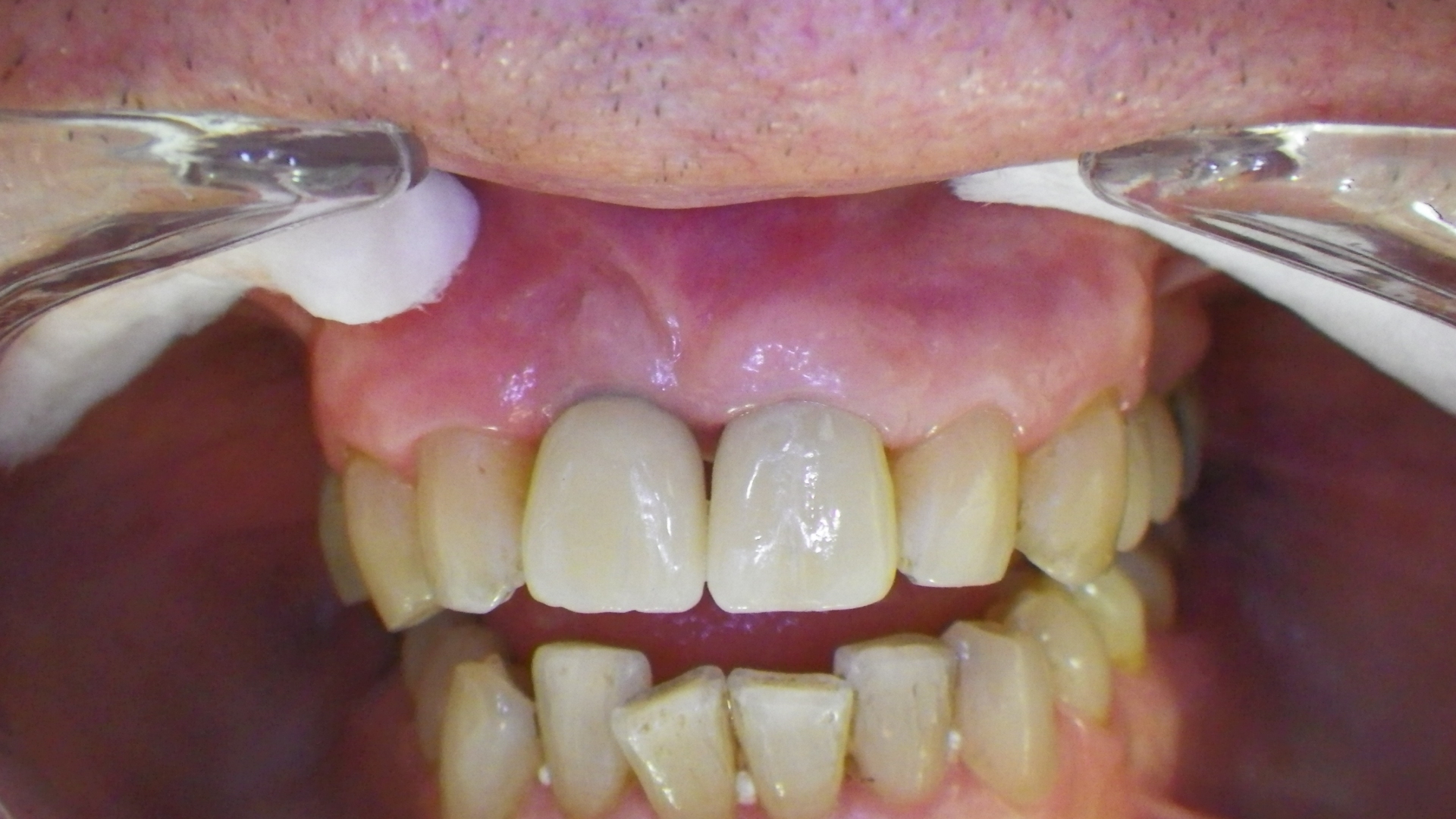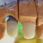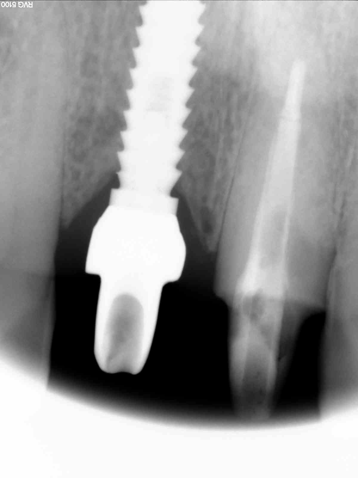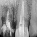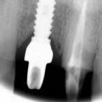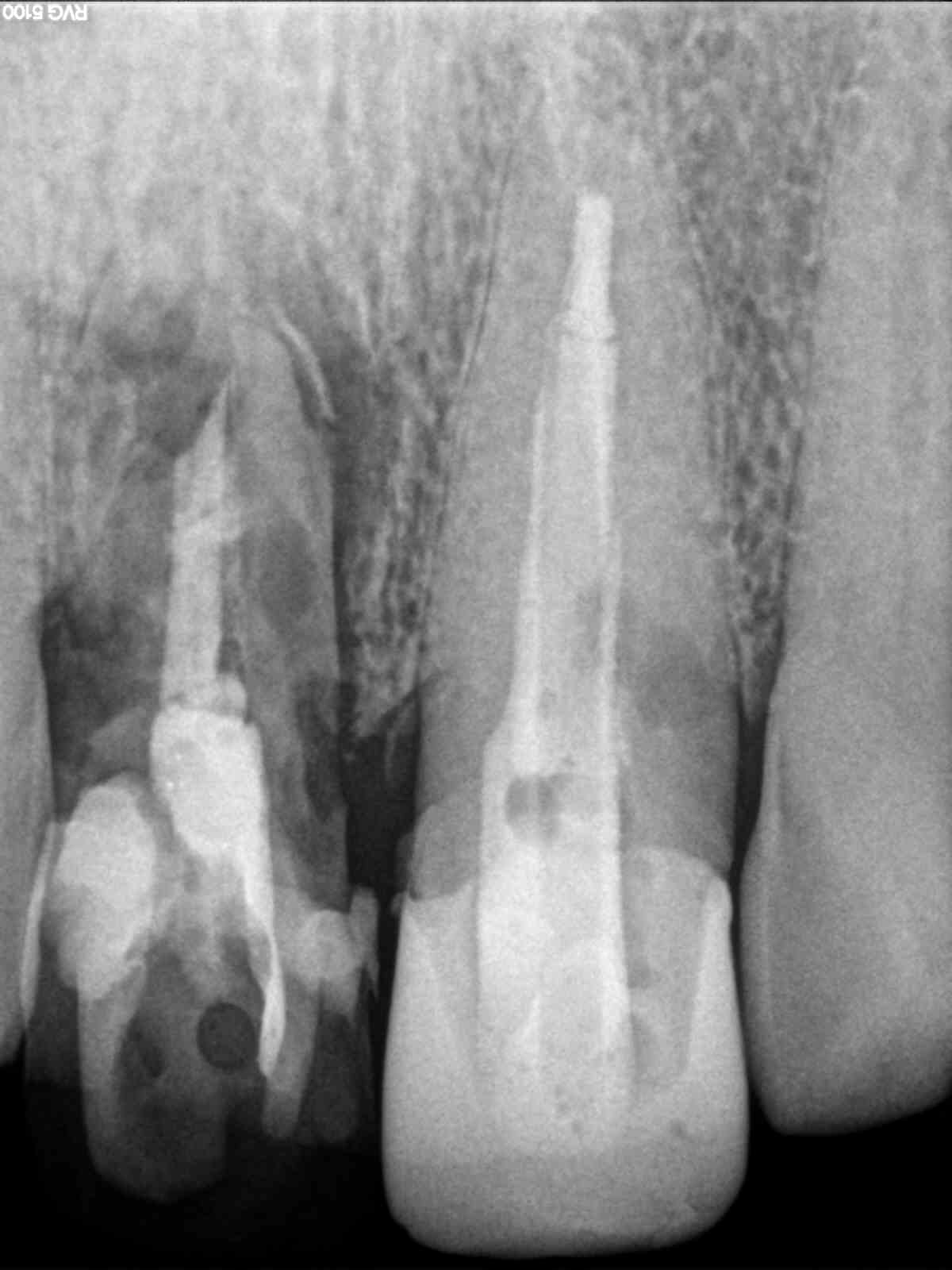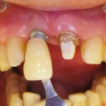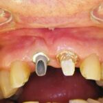 Este paciente llegó al consultorio con reabsorción dentinaria (pérdida de la estructura del diente). Por ello se le extrajo el diente, se le colocó un implante y se restauraron las piezas con coronas de cerámica pura.